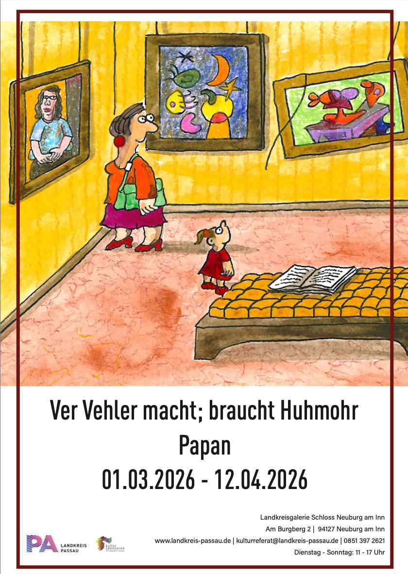 Seine Rubriken „Dingsbums“ und „Der undressierte Mann“ gehörten viele Jahre zu den meistbeachteten Cartoonseiten im Magazin „Stern“, er hat rund 30 Bücher veröffentlicht und begeistert mit seiner oft beißenden gezeichneten Satire seine Fans: Manfred von Papen, bekannt als „Papan“ ist einer der bedeutendsten deutschen Cartoonisten. Für die Landkreisgalerie auf Schloss Neuburg, in der Papan ab Sonntag, 1. März ausstellt, ist die Präsentation „Ver Vehler macht; braucht Huhmohr“ schon zu Beginn des Jahres ein Höhepunkt.