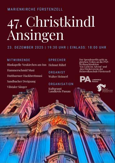Seit den 70er Jahren ist am Tag vor Heiligabend der "Dom des Rottals" wieder die Bühne für einen außergewöhnlichen musikalischen Abend. Um 19:30 Uhr beginnt in der Pfarrkirche Mariä Himmelfahrt in Fürstenzell das Programm. Es ist mittlerweile das 47. Christkindl-Ansingen, seit die Veranstaltung 1977 von dem damaligen Landrat Baptist Kitzlinger ins Leben gerufen wurde. Lediglich in den Jahren 1996 - 2000 wurde das Ansingen in anderen Kirchen des Landkreises durchgeführt, da die Fürstenzeller Kirche damals grundlegend renoviert wurde. In den Jahren 2020 und 2021 musste die Veranstaltung pandemiebedingt pausieren.