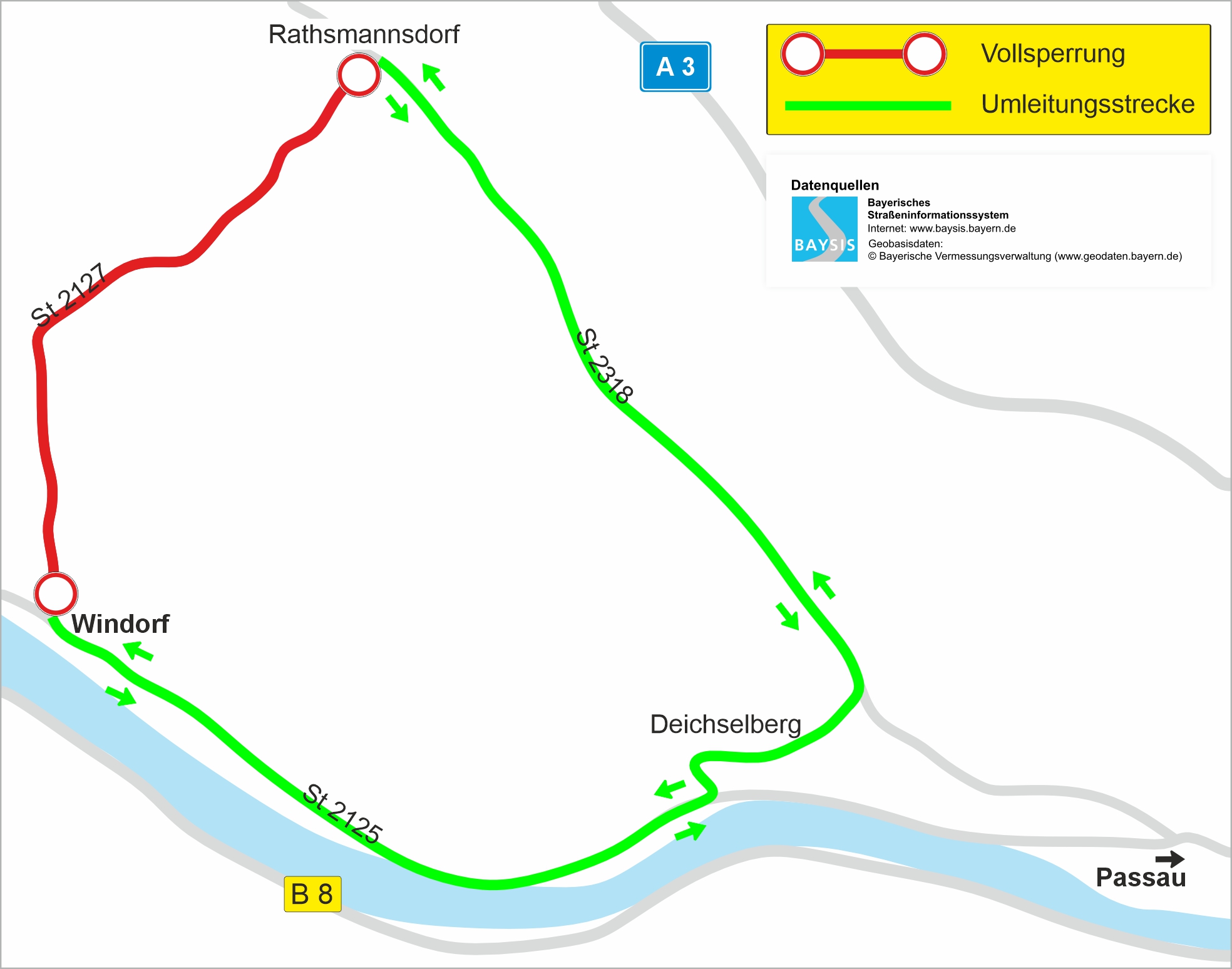 Die Umleitung verläuft ab Windorf auf der St 2125 bis Besensandbach und dort ab Deichelberg auf der St 2318 bis Rathsmannsdorf, in der entgegengesetzten Richtung verläuft die Umleitung analog.